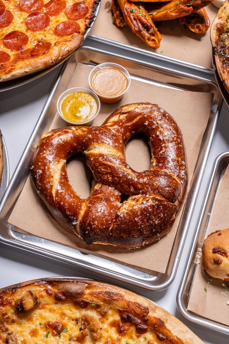 Fresh-baked pretzel from Das Pretzel Haus served with beer cheese dip (V)